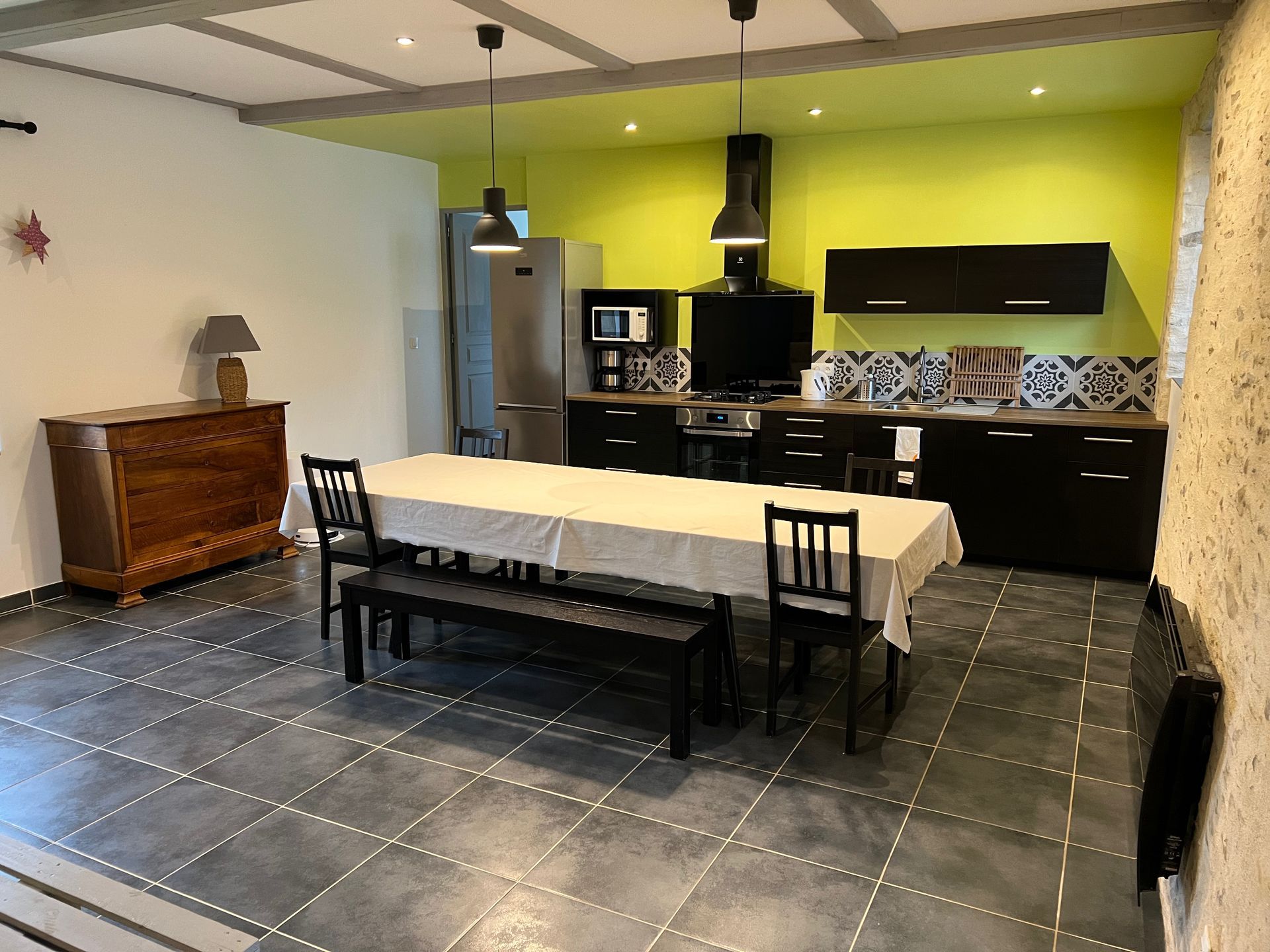 Cuisine équipée ouverte sur salon pouvant accueillir une quinzaine de convives pour un moment convivial.